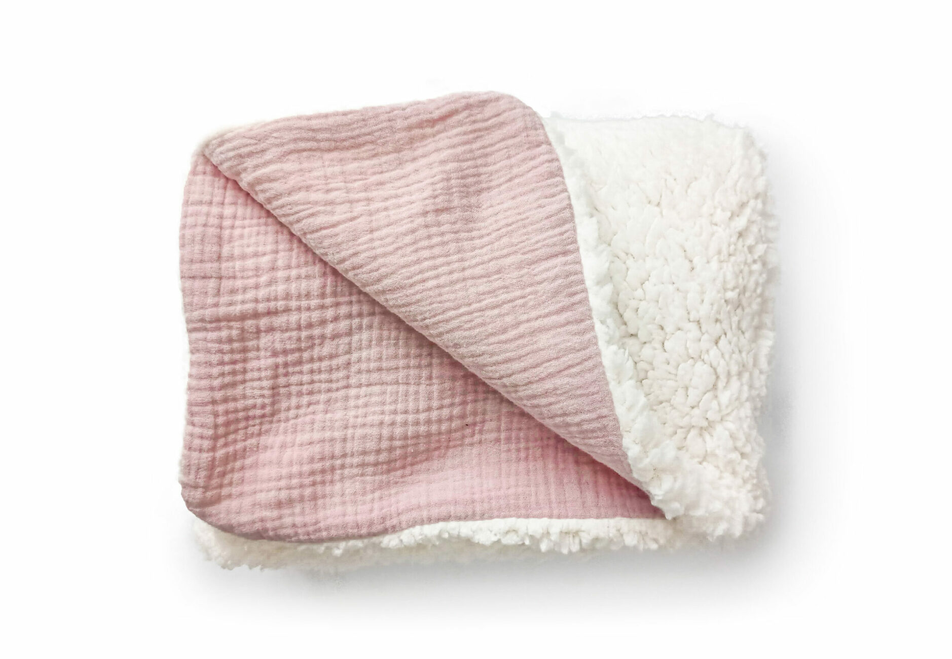Zimowy kocyk w delikatniejszej wersji – wykonany z nieziemsko miękkiej i przyjemnej tkaniny o strukturze baranka w kolorze ecru oraz organicznego muślinu bawełnianego.